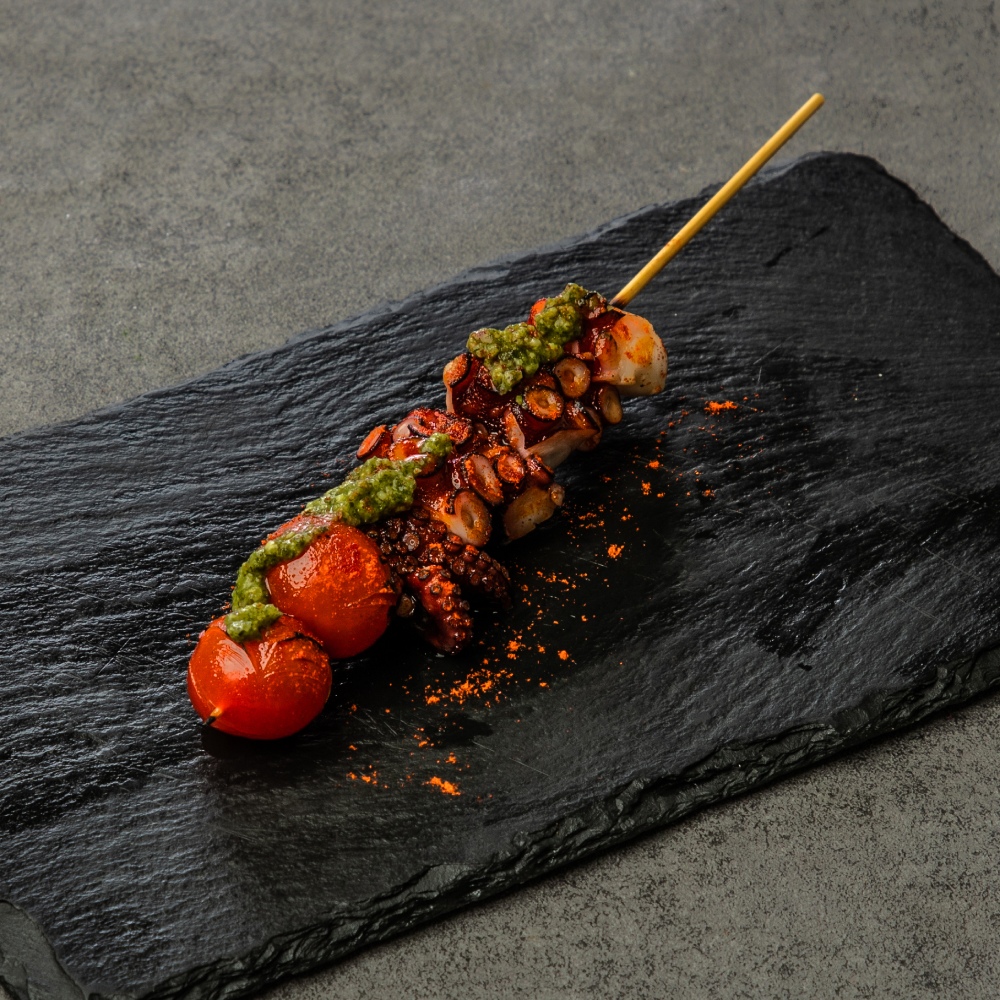 肉やシーフードと彩り鮮やかな野菜を組み合わせた14種のスパニッシュ串焼き