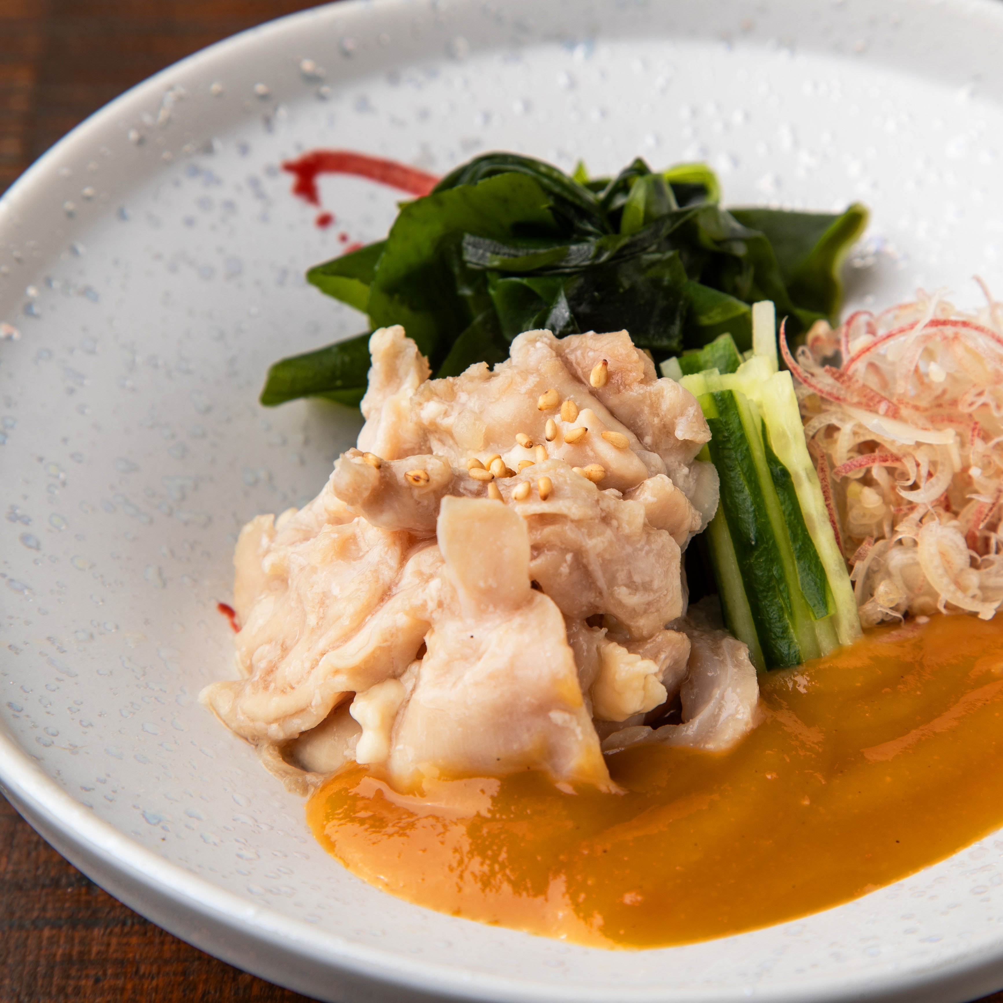 生ハム仕立てで、皮はこんがり炙る事により、噛みしめるたびに、肉の甘みを感じられます。さっぱりとしたポン酢で召し上がってください。