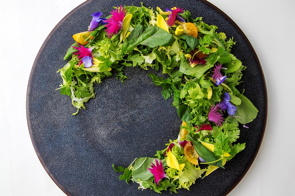 フリルレタスを中心とした一見スタンダードなグリーンサラダ。少し視線を上げて俯瞰で見ると…そこに現れるのは神秘的な クレッセントムーン!思わずSNSでアップしたくなる映え系 サラダですが、ドレッシングを纏った完成形の味わいは#映え に留まらないしっかり実力派です。