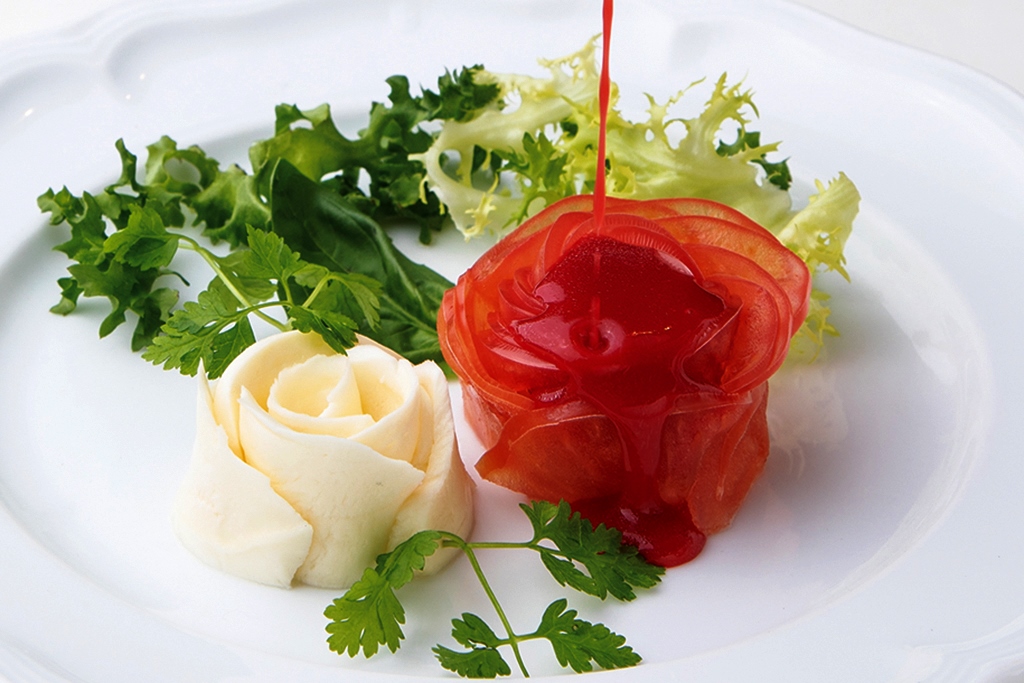 赤の女王様の庭園に白薔薇はご法度!見つけたトランプ兵は慌てて紅く染めるのですが…。「不思議の国のアリス」の物語の中でも最も有名なエピソードの一つをモチーフとしたメニューがこちら。モッツァレラチーズの白い薔薇と、真っ赤なフランボワーズソースの相性は抜群です。