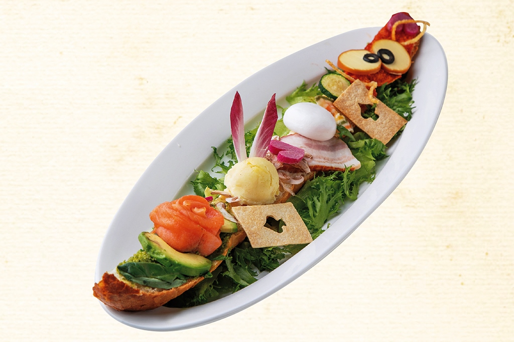 いつもせかせか時間に追われている白うさぎ、コロンと転がるとあっさり割れてしまう卵の紳士ハンプティ・ダンプティ、突然現れたり不意に消えたり…神出鬼没のチェシャ猫が、一同に会する世にも稀なプレート。4〜5名のちょっとしたパーティのスタートはこんな一皿が何よりよく似合います。