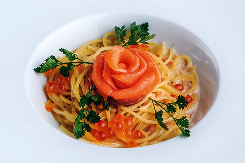 クリーミーなソースのパスタがお好みの方にはこちらがオススメ!ぷちっと弾けるいくらの旨みとクリームソースのマリアージュはちょっぴりオトナな味わいを醸し出し、お城の庭に咲き誇る真っ赤な薔薇を思わせるサーモンの花びらも合わせると、ご馳走感がたっぷり増す贅沢パスタです。