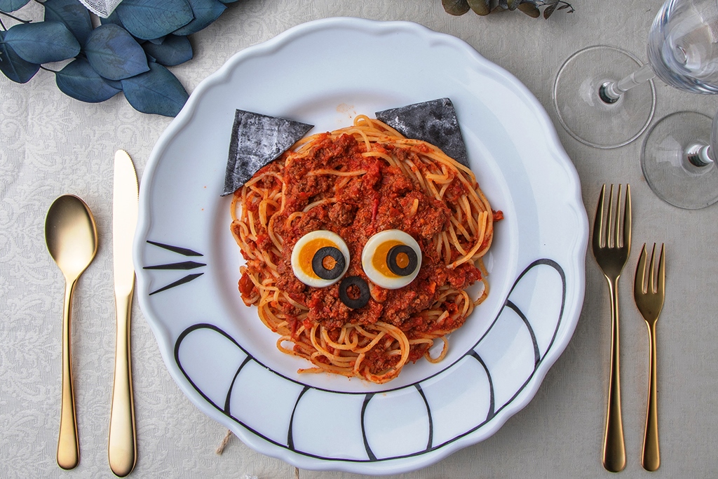 チェシャ猫を模した可愛らしい見た目に騙されることなかれ。ハートの女王様お抱えのお城の料理人達が本領を発揮したパスタは、怒りん坊のハートの女王様さえ笑顔にした本格派イタリアン。トマトに牛肉の旨みがたっぷり溶け込んだラグーソースの香りがより一層食欲をそそります。