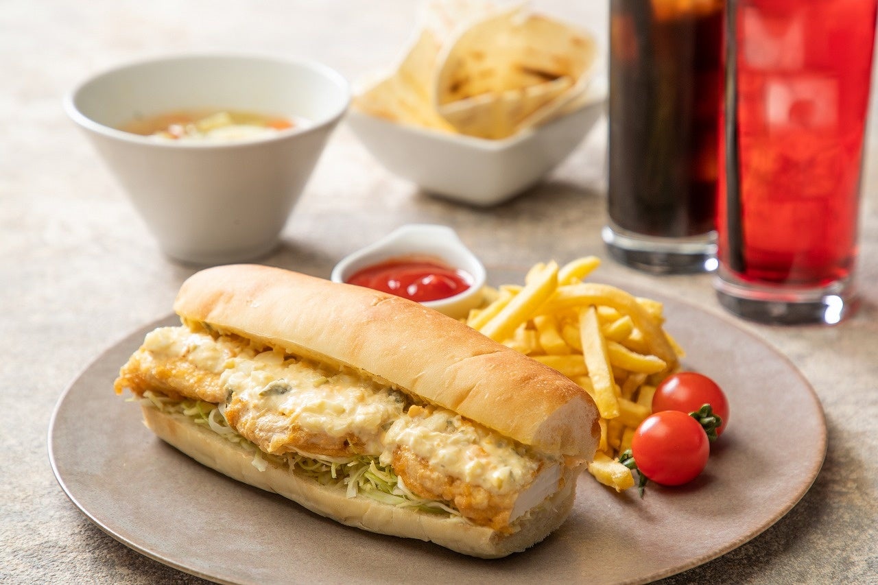 鶏のむね肉を使用したさっぱりのチキン南蛮をいぶりがっこを入れたタルタルソースとキャベツと共に卵の入っていない小麦の自然な甘味が生きたコッペパンでサンド。