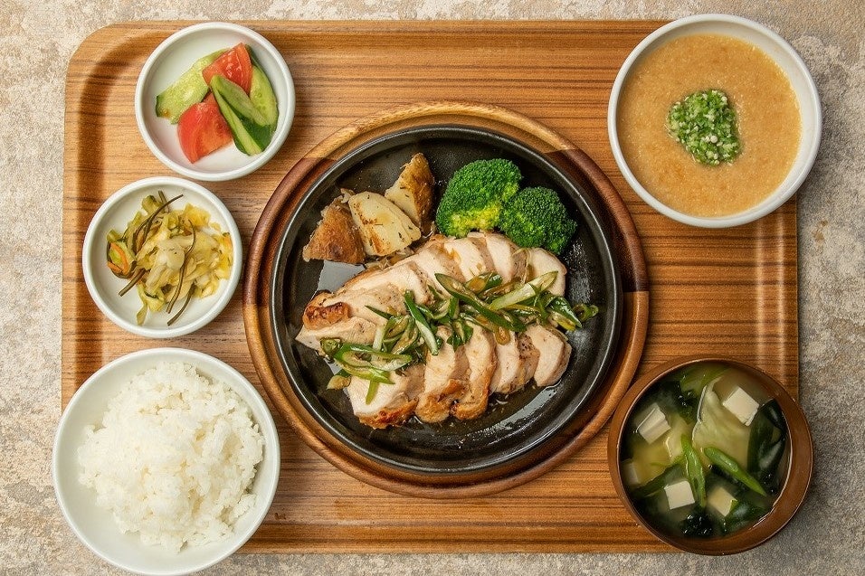 大山地鶏のむね肉を低温でじっくり焼き上げ、しっとりとした旨味を閉じ込めました。ポン酢と九条ねぎでさっぱりしながらも、しっかりとした味わいはご飯との相性も抜群!身体にプラスの高たんぱく・低カロリー定食。