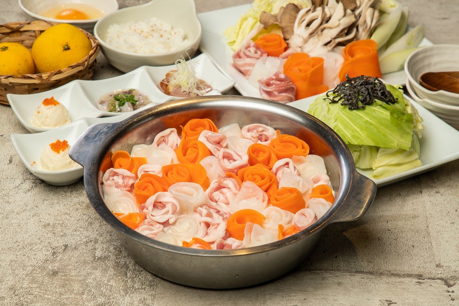 鍋は『塩もつ鍋』『豆乳フラワーしゃぶしゃぶ鍋』『濃厚あん肝鍋』の3種をご用意。一番人気の『塩もつ鍋』は、コクと旨味が凝縮された特製スープにプリプリの国産もつとキャベツ、もやし、キノコ類がたっぷり入った定番鍋です。昨年から加わった『豆乳フラワーしゃぶしゃぶ鍋』はまるで花畑のような美しいビジュアルが特徴で、豆乳ベースのまろやかなスープに、旨味たっぷりの「和豚もちぶた」とシャキシャキ野菜をしゃぶしゃぶで召し合って頂くヘルシーな鍋となっております。『濃厚あん肝鍋』は“海のフォアグラ”と言われる「あん肝」が味噌仕立ての濃厚スープにとろける贅沢な鍋となっております。非日常を体験できる「こたつテラス鍋プラン」は来年3月までお楽しみいただけます。