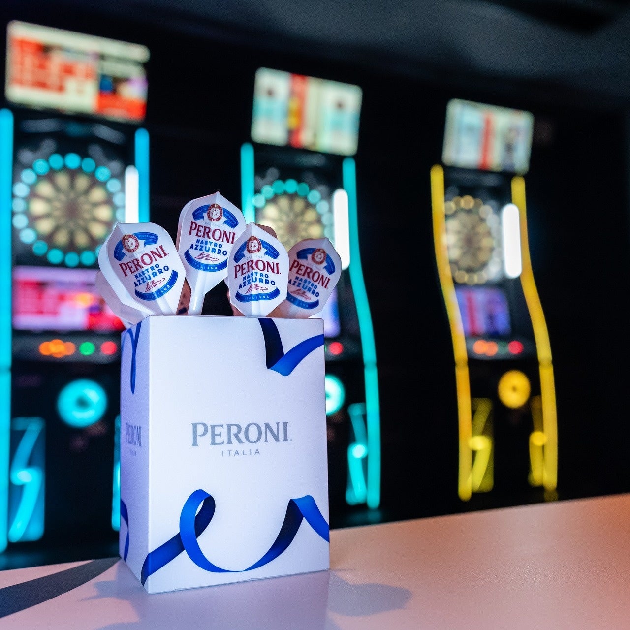 10月より「バネバグース宮益坂店」はプレミアムイタリアンビール『ペロー二 ナストロアズーロ』の旗艦店として期間限定でコラボレーションいたします。『ナストロアズーロ』とはイタリア語で『青いリボン』という意味ですが、期間中店内は爽やかな風にのって青いリボンが舞うイメージに包まれ、『ペローニ ナストロアズーロ』一色に。吹き抜けから見下ろすペローニ特設ビリヤードや筐体がペローニで統一されたダーツ機など、圧巻のロケーションが体験いただけます。