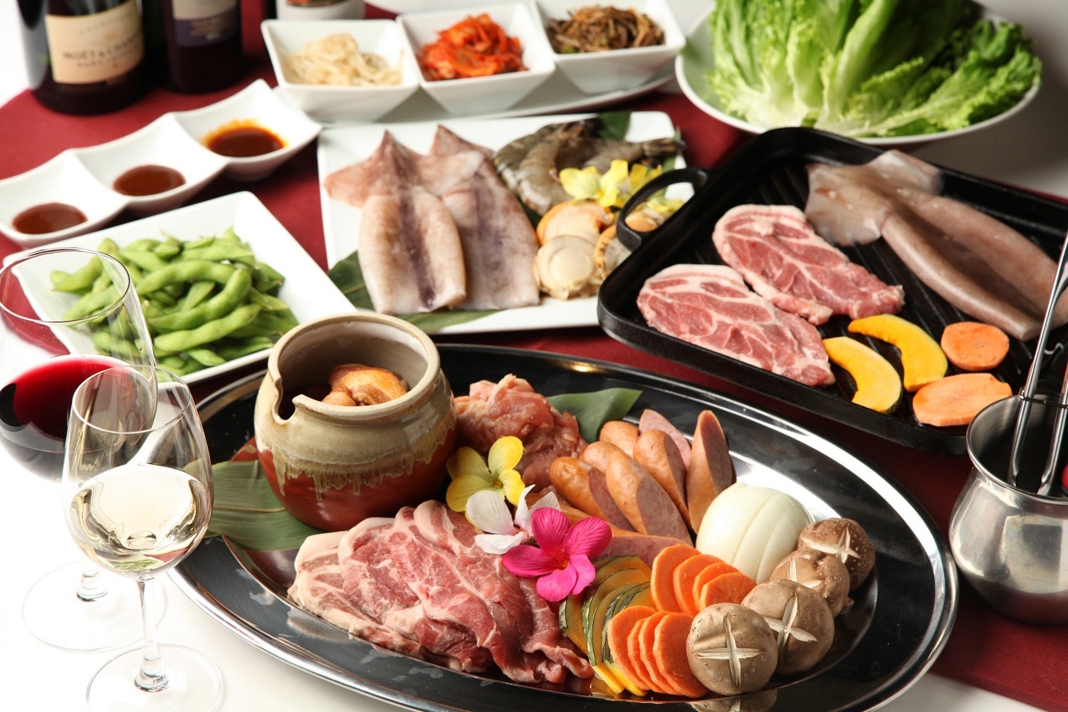 ◇枝豆 ◇前菜3種盛り ◇赤海老、丸ごとイカ、大粒ホタテの海鮮盛り合わせ ◇牛カルビ・豚肩ロース・鶏モモ肉・ソーセージのお肉4種盛り合わせ ◇野菜の盛り合わせ4種(玉ねぎ・人参・茄子・椎茸)◇サンチュ