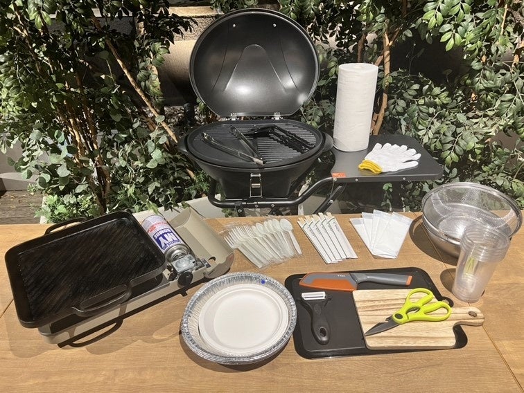 ガスコンロ / ガスボンベ(1本) / フライパン / 調理用トング / 包丁+まな板 / ボウル+ざる / コテ(2本セット) / ピーラー / 手鍋+お玉 / エレキコンロ / 紙皿(5枚) / 割箸(5膳) / 竹串(10本) / プラスプーン(5本) / プラフォーク(5本) / プラコップ(5個) / おしぼり(5枚) / アルミホイル(1本) / 使い捨てまな板(3枚) / キッチンペーパー / 軍手(1組) / ポリ手袋(2セット) / タオルセット(3枚) / 氷(1kg) / ワインオープナー / ハサミ