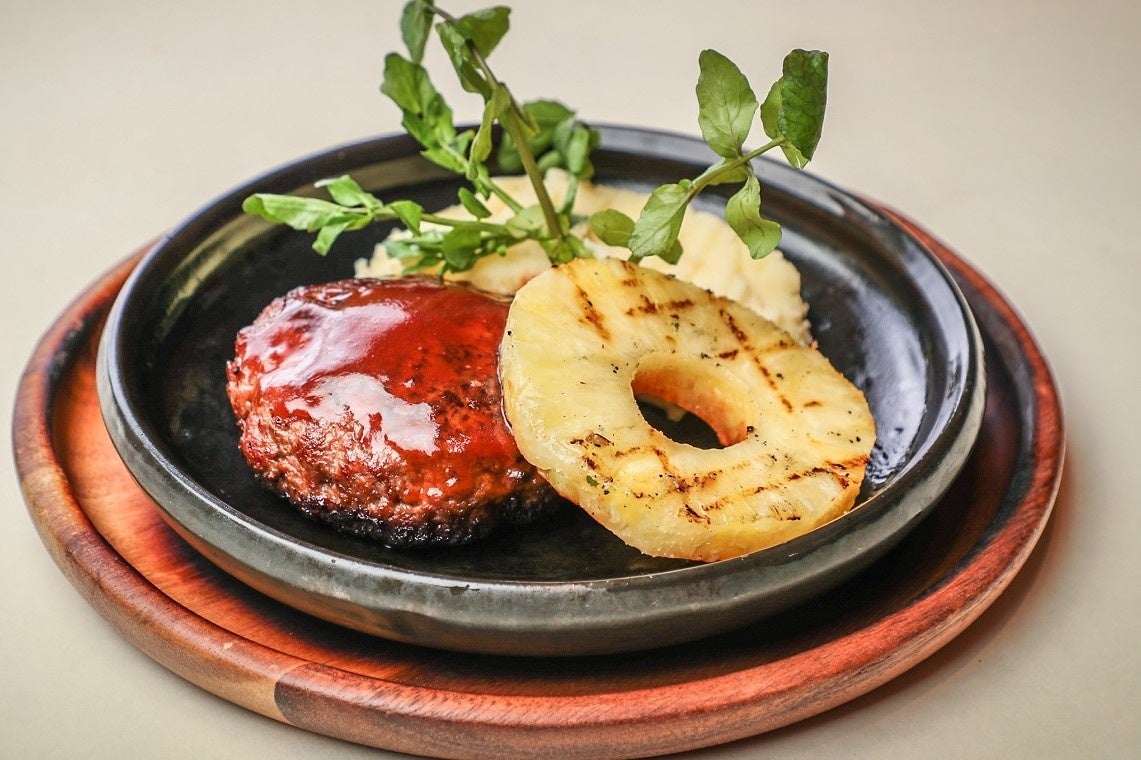 ハーフパウンド220gのハンバーグにマッシュポテトとグリルパインが付いた大ボリュームのリゾートキングメニュー。BBQソースでグリルし甘酸っぱさが増したパイナップルはハンバーグの旨味と絡みあい相性抜群。夏らしい一品です。