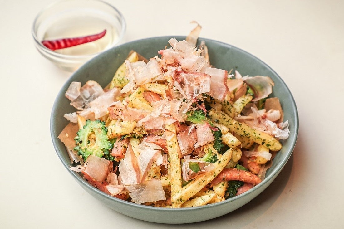 沖縄料理の代表「ゴーヤチャンプルー」にフライドポテトをMIXしたアグレッシブなローディットポテト。ぬちゃっとした鰹出汁と醤油を吸ったポテトは、”ぬちゃポテ”という新たなジャンルを確立。お好みで沖縄のビリ辛調味料「コーレーグース」をかければ、また違った味わいをお楽しみいただけます。