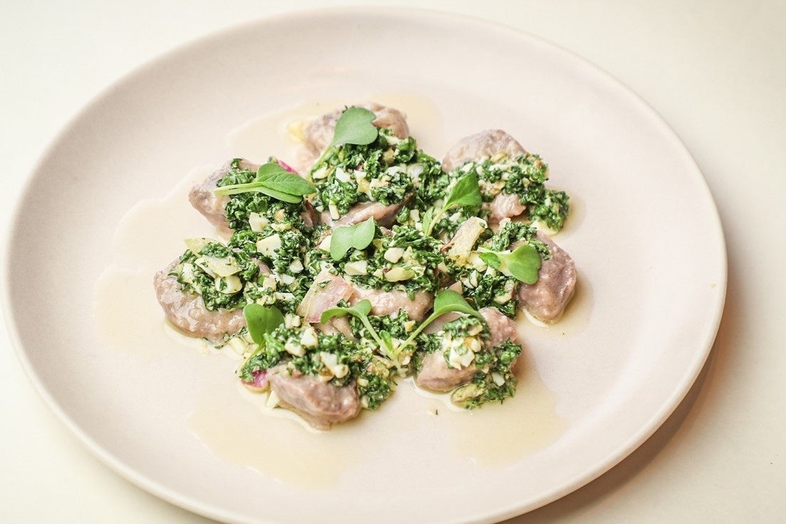 丁寧に処理して火入した鳥取産大山鶏の砂肝はアンチョビオイルにつけ込みコンフィに。酸味と旨味のあるサルサヴェルデをたっぷりかけて味わうPUBらしいおつまみ冷菜メニュー。