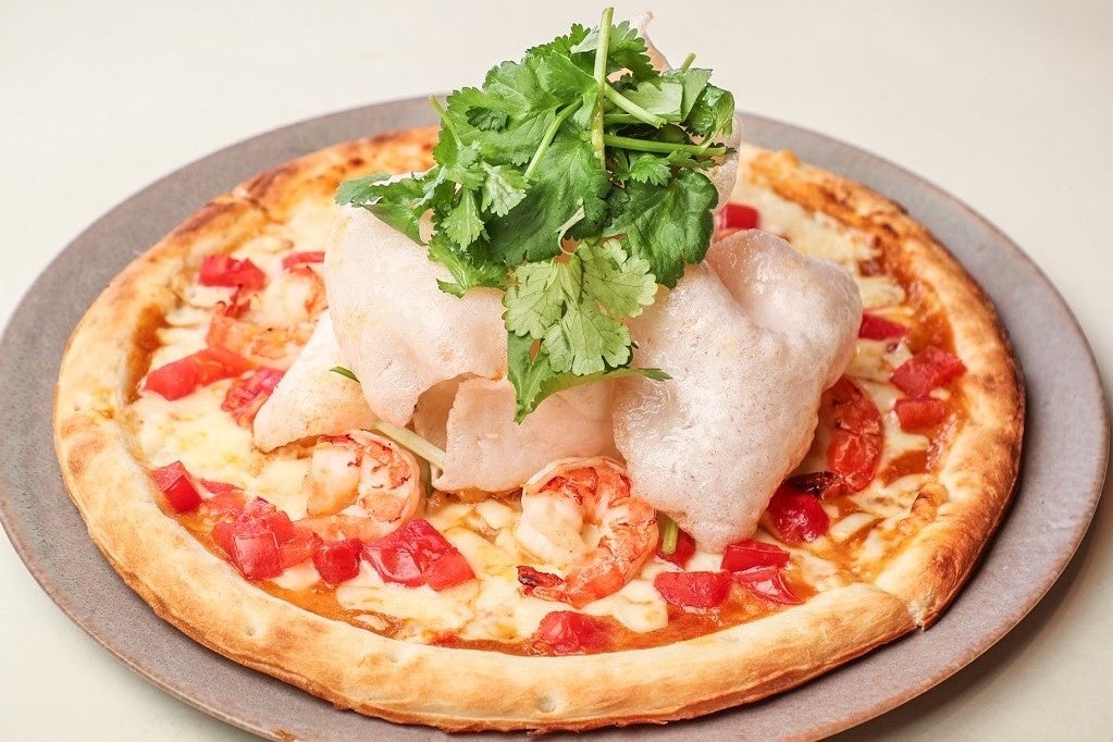 トムヤムクンソースを使用したピザ生地に海老やフレッシュトマト、サクサク食感が楽しいタイ名物「えびせん」をトッピング。イタリアンにアジアンテイストをプラスした新感覚ピザが誕生。