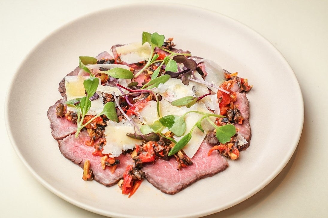 タリアータとは牛肉を薄く切ってお皿に盛り付けるシンプルなイタリア料理。蔵王牛のスライスに刻んだドライトマトとオリーブのソース、削りたてのパルミジャーノチースが絶妙に絡み合う見た目も華やかな一品。
