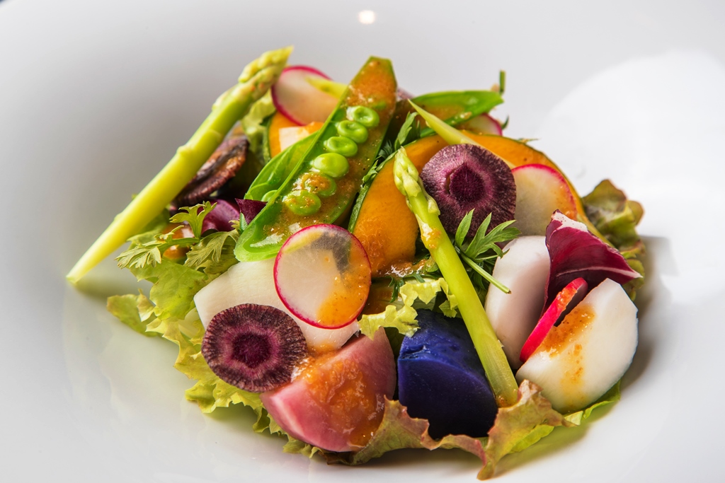 ノーザンルビーとシャドークイーンというカラフルなじゃがいも2種を中心に据え12種類もの野菜で脇を固めた豪華なサラダ。見た目にも美しく、さらに身体に取り入れることで美と健康にも良さそうな女性にとりわけ嬉しいサラダです。