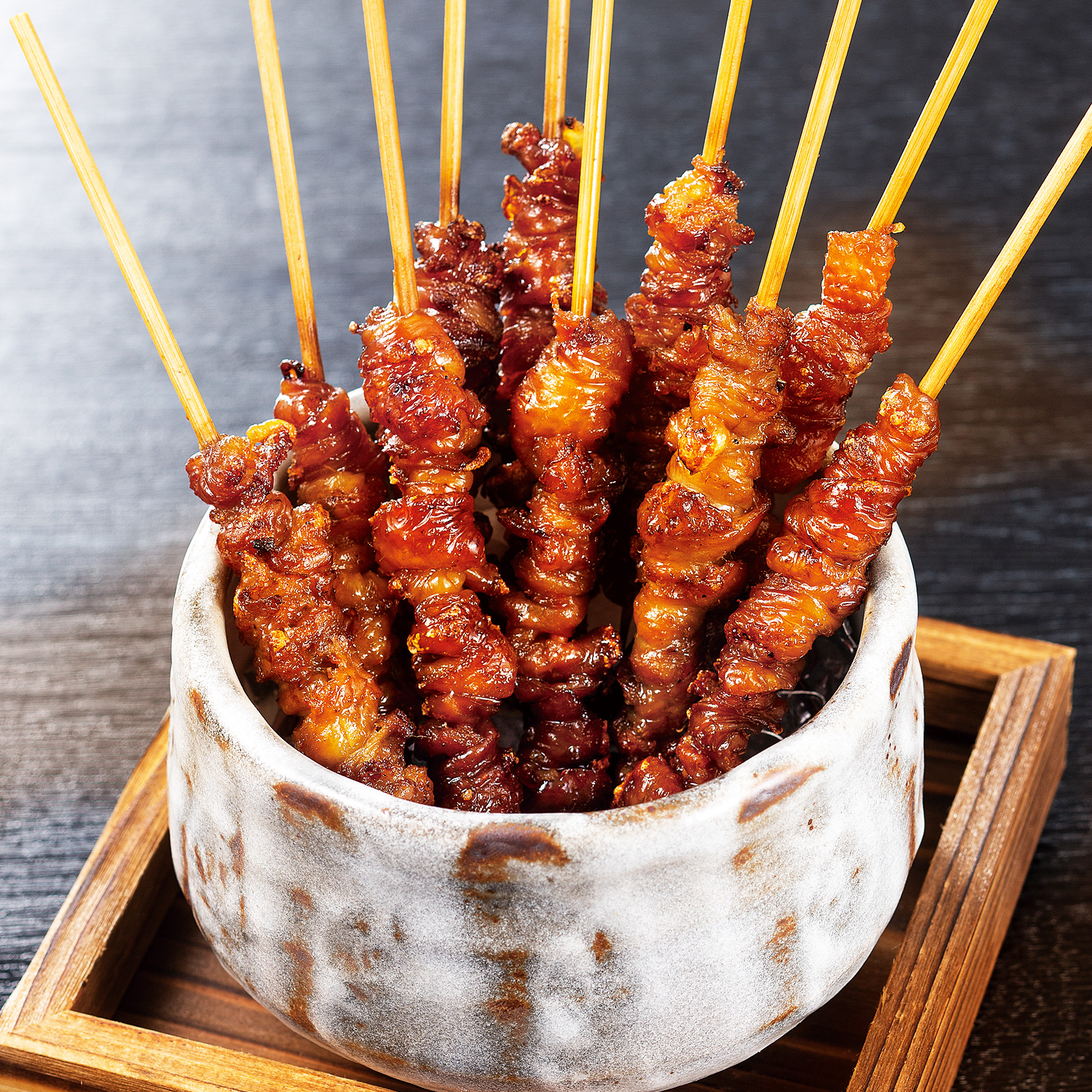 表面をカリッと焼き上げ、中はジューシーな旨みが楽しめる当店の「かわ串」は5日間かけて1本1本丁寧に焼き上げます。