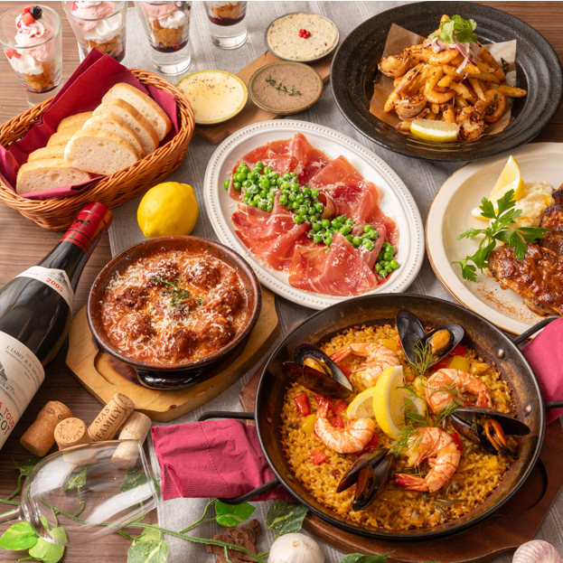 お通しとして提供する”おかわり自由”な自慢のチャパタは、出汁の効いたアヒージョ等、様々な料理と相性抜群!その他にも生米から炊いたパエリアやオリジナルタパスなど、バラエティ豊かなスペイン料理の数々をお楽しみいただけます。